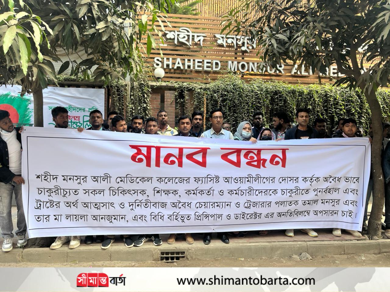 মানববন্ধনে অংশগ্রহণকারীরা অভিযোগ করেন, শহীদ মনসুর আলী মেডিকেল কলেজ ট্রাস্টের সঙ্গে সংশ্লিষ্ট ফ্যাসিবাদী আওয়ামী লীগের দোসর একটি চক্র দীর্ঘদিন ধরে অবৈধভাবে এবং ক্ষমতার অপব্যবহার করে প্রতিষ্ঠানটি পরিচালনা করে আসছে। তাদের স্বেচ্ছাচারী সিদ্ধান্তের ফলে নিয়ম বহির্ভূতভাবে বহু চিকিৎসক, শিক্ষক, কর্মকর্তা ও কর্মচারীকে চাকরিচ্যুত করা হয়েছে, যা সম্পূর্ণ বেআইনি ও অন্যায়।
