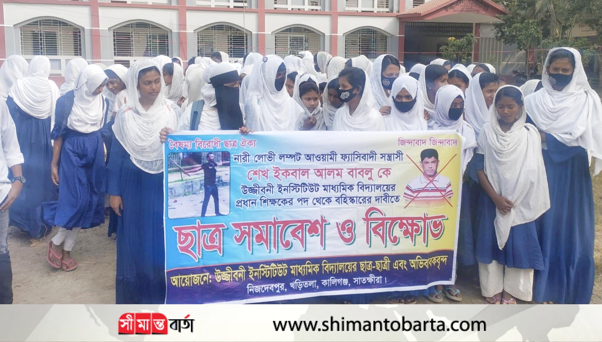 হাফিজুর রহমান, কালিগঞ্জ (সাতক্ষীরা) থেকেঃ বিদ্যালয়ের ছাত্রীদের গোপন কক্ষে ডেকে নিয়ে যৌন হয়রানি এবং জন্মদিন পালন উপলক্ষে ছাত্রীদের সঙ্গে অশালীন আচরণের প্রতিবাদে বহুল আলোচিত প্রধান শিক্ষক ইকবাল আলম বাবলুর অপসারণের দাবিতে গত ১ সপ্তাহ জুড়ে শিক্ষার্থীরা বই পাঠ্যপুস্তক রেখে আন্দোলনে মাঠে নেমেছে। ঘটনাটি ঘটে চলেছে সাতক্ষীরার কালিগঞ্জ উপজেলার মথুরেশপুর ইউনিয়নের নিজদেবপুর গ্রামে অবস্থিত উজ্জীবনী ইনস্টিটিউট মাধ্যমিক বিদ্যালয়ে। ছাত্রীদের যৌন হয়রানির প্রেক্ষিতে সাতক্ষীরা জেলা প্রশাসকের নির্দেশে অত্র বিদ্যালয়ের ম্যানেজিং কমিটির সভাপতি ও উপজেলা নির্বাহী কর্মকর্তা অনুজা মণ্ডল গত ২১ নভেম্বর অভিযুক্ত প্রধান শিক্ষক ইকবাল আলম বাবলুকে ১০ কার্য দিবসের মধ্যে জবাব দাখিলের জন্য কারণ দর্শানোর নোটিশ জারি করেছে। এদিকে গত ১৮ তারিখ হতে অদ্যবধি প্রধান শিক্ষককে অপসারণ না করা পর্যন্ত বিদ্যালয়ে বা কোন পরীক্ষায় অংশ নেবে না বলে আন্দোলন অব্যাহত রেখেছে। রবিবার (২৪ নভেম্বর) বেলা ১২ টার সময় ঐ বিদ্যালয় গেলে প্রধান শিক্ষক ইকবাল আলম বাবলুর হাতে যৌন নিগ্রহের শিকার নবম শ্রেণীর ৬ জন এবং দশম শ্রেণীর ১ জন ছাত্রী সাংবাদিকদের তারা জানান প্রধান শিক্ষক ইকবাল আলম বাবলু এই বিদ্যালয় যোগদানের পর হতে প্রায় ছাত্রীদের ডেকে নিয়ে তার অফিসরুমে বিভিন্নভাবে যৌন হয়রানি চালিয়ে আসছিল। বিষয়টির প্রতিবাদ করায় পরীক্ষায় ফেল করানোর ছাড়াও শারীরিকভাবে নির্যাতন করা হতো বলে ভুক্তভোগীরা জানায়। অফিসটা তাহার নিজের বাড়ি মনে করে গোপন কক্ষ এবং রান্নাঘর বানিয়ে রাজনীতি কর্মকান্ড পরিচালনাসহ সেখানে এই সমস্ত কর্মকাণ্ড চালিয়ে আসছিল। গত ৩০ অক্টোবর নিজের খরচে ছাত্রীদের জন্মদিন পালন করার জন্য স্কুলের ছুটির পরে তার গোপন কক্ষে নিয়ে ছাত্রীদের শারীরিকভাবে যৌন হয়রানি করে। বিষয়টি নিয়ে ছাত্র ছাত্রীরা প্রধান শিক্ষক ইকবাল আলম বাবলুকে অপসারণের দাবিতে গত ১৮ নভেম্বর আন্দোলনে মাঠে নামে। ওই সময় শিক্ষক ইকবাল আলম বাবলুকে অফিসে আটকে রেখে ছাত্র-ছাত্রী অভিভাবকরা ক্ষিপ্ত হলে পরিস্থিতি নিয়ন্ত্রণে আনতে উপজেলা নির্বাহী কর্মকর্তার নির্দেশে উপজেলা মাধ্যমিক শিক্ষা কর্মকর্তা বাকিবিল্লাহ এবং সহকারি কমিশনার (ভূমি) অমিত কুমার বিশ্বাস পুলিশ ফোর্স নিয়ে ঘটনাস্থলে যেয়ে পরিস্থিতি নিয়ন্ত্রণ আনতে ব্যর্থ হয়। অবশেষে বিকাল ৪ টার দিকে সেনাবাহিনীর হস্তক্ষেপে অবরুদ্ধ প্রধান শিক্ষককে উদ্ধার করে মুক্ত করা হয়। এ বিষয়ে গত ১৯ জানুয়ারি ভুক্তভোগী শিক্ষার্থীরা অত্র স্কুলের ম্যানেজিং কমিটির সভাপতি ও উপজেলা নির্বাহী কর্মকর্তার নিকট লিখিত স্মারকলিপে দিতে গেলে ত্রুটির কারণে সেটা সংশোধন করে গ্