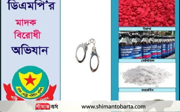 ডিএমপির নিয়মিত মাদক বিরোধী অভিযানের অংশ হিসেবে সোমবার সকাল ছয়টা থেকে আজ সকাল ছয়টা পর্যন্ত রাজধানীর বিভিন্ন থানা এলাকায় অভিযান চালিয়ে মাদকদ্রব্য উদ্ধারসহ তাদেরকে গ্রেফতার করা হয়।