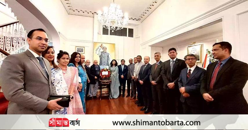 আলোচনা অনুষ্ঠানে আসা ব্রিটিশ বাংলাদেশি অতিথি, বীর মুক্তিযোদ্ধা এবং হাই কমিশনের কর্মকর্তাদের নিয়ে বঙ্গবন্ধুর প্রতিকৃতিতে প্রতিকৃতিতে ফুল দিয়ে শ্রদ্ধা জানান হাইকমিশনার।